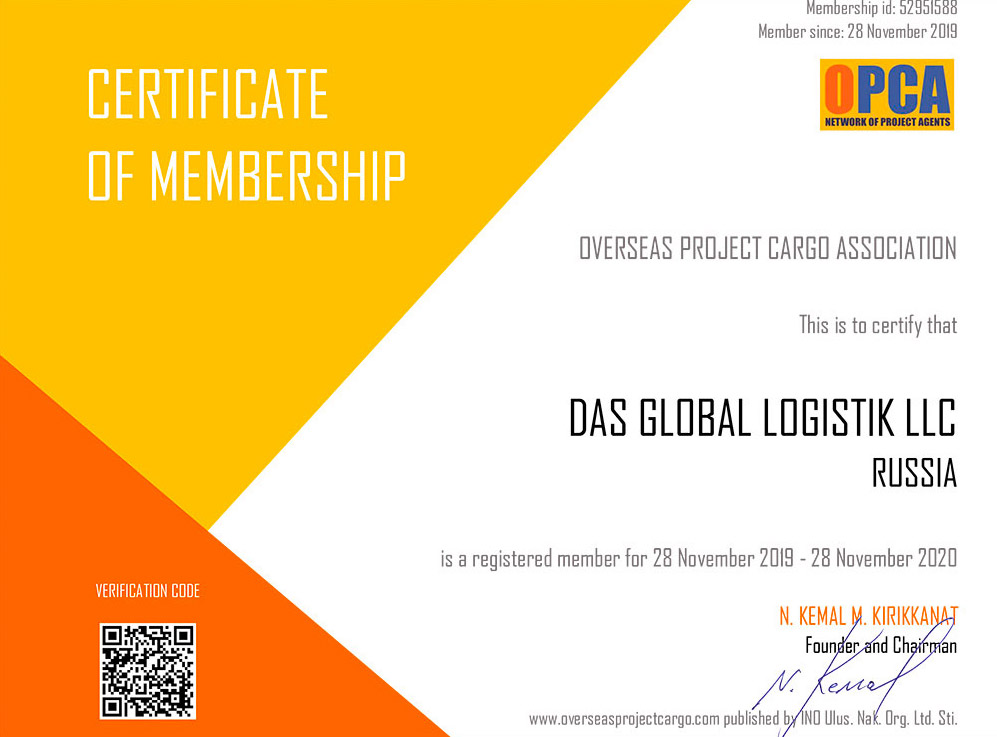 - Сертификат, подтверждающий членство в OPCA по проектным грузам на 2019-2020 гг.